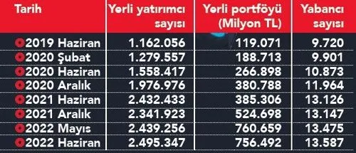 Merkezi Kayıt Kuruluşu verilerine göre 2021 sonunda 2 milyon 341 bin olan yerli yatırımcı sayısı, bu yılın haziran sonu itibarıyla 153 bin kişiden fazla artarak 2 milyon 495 bine ulaştı. Bu dönemde yabancı yatırımcı sayısı da 13 bin 147'den 13 bin 587'ye çıktı. Yerlilerin 2021 sonunda 524.7 milyar lira olan hisse senedi portföylerinin tutarı, haziran sonunda 756.5 milyara çıktı. Yerli yatırımcı sayısı son 2 yılda 937 bin kişi arttı. Bu dönemde yerlilerin portföyü ise yüzde 183 arttı.